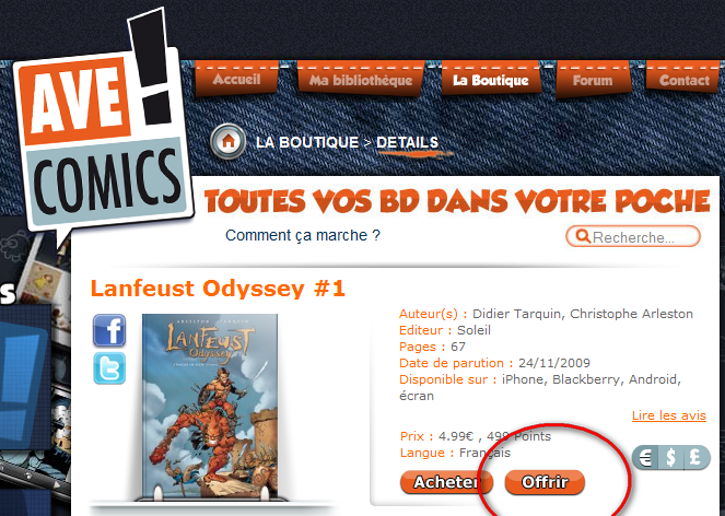 eBouquin rapporte l’initiative d’AveComics qui permet d’offrir en un clic un eBook (voir capture écran infra).