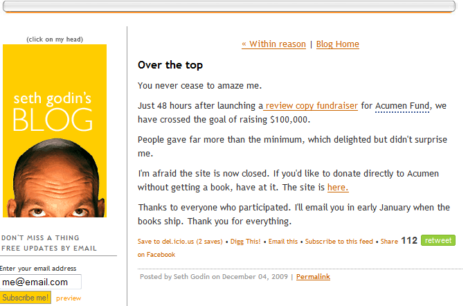 L’opération de marketing viral a porté ses fruits : les dons sont au niveau attendu, la caisse de résonnance au travail de Seth Godin est déjà en train de commencer à vibrer.