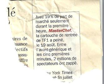 Le week-end dernier, à la lecture de Challenges, j’ai réagis à la brève ci-dessus : Lors de sa première diffusion, en 5 minutes, Master Chef a perdu 2 millions de spectateurs !